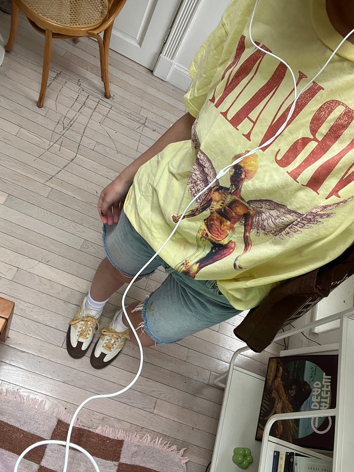 In the first pic below, I am wearing a (very wrinkled) Nirvana tee from Daydreamer, RE/DONE denim shorts, and my new Adidas Sambas from END. (they have the best colorways). In the second pic, the same shorts, along with a “Kensington, London” tee from Zara (bought it out of study abroad nostalgia), Zara flip flops with a mini heel and my Baggu x Sandy Liang bag.