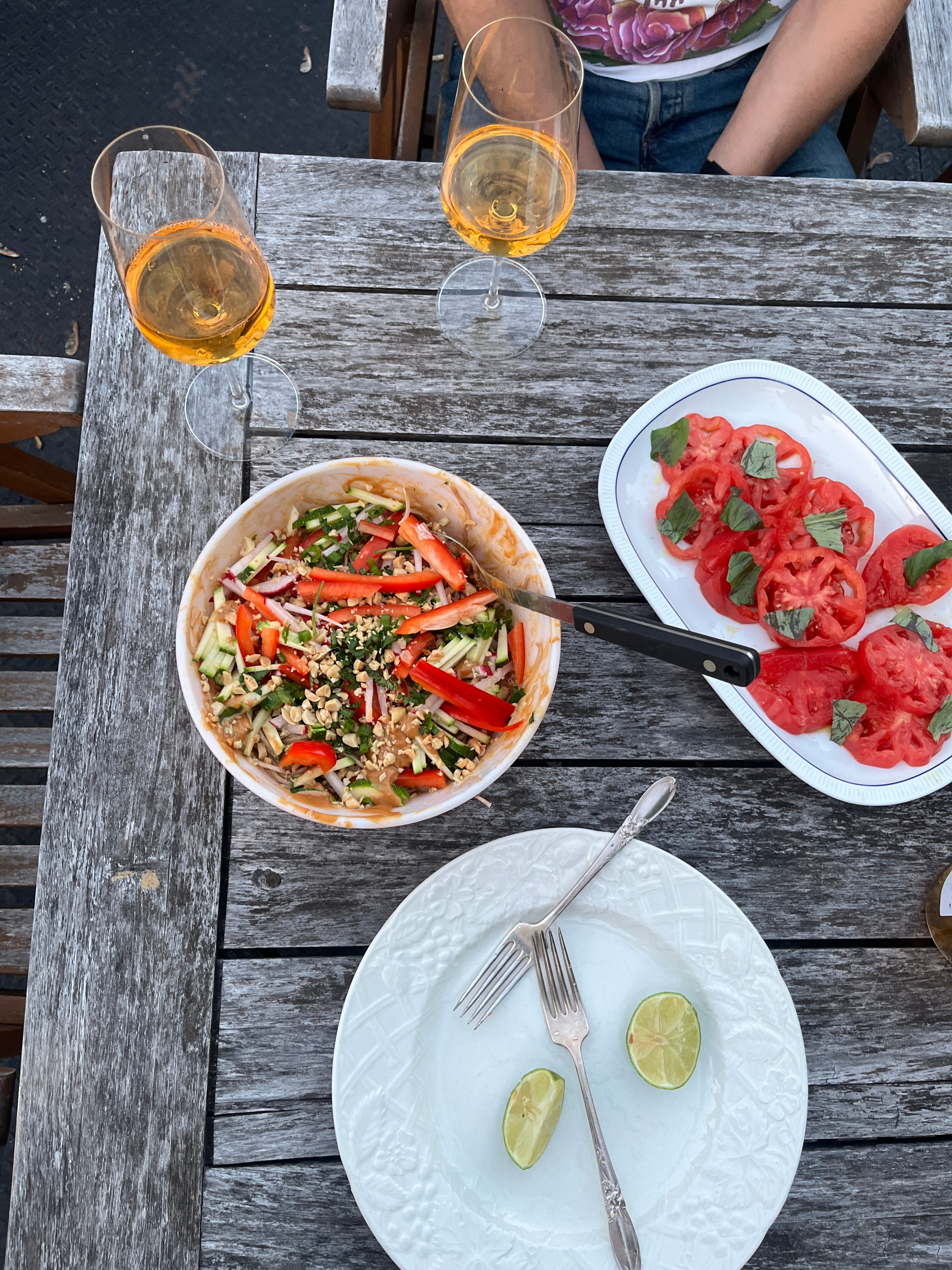 My first guest was my boyfriend Charlie. He picked up a bottle of orange wine and I made a NYT Cooking Cold Noodle Salad with Spicy Peanut Sauce (recipe here) and laid out some heirloom tomatoes sprinkled with with basil, Graza Olive Oil, and Maldon salt (of course). TBH - these heirloom tomatoes were from Whole Foods and not quite heirloom enough for me (I want them green and ugly!).